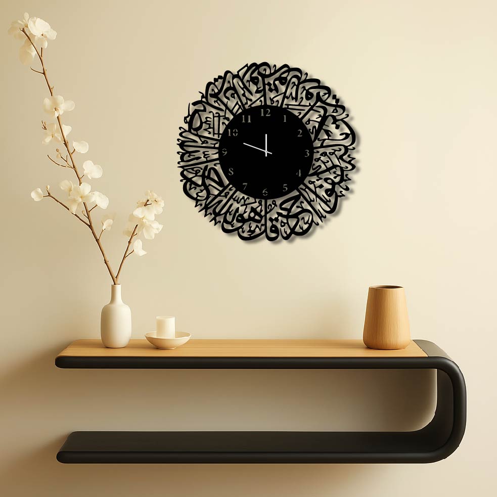 Bring your space to life with this beautiful "SURAH IKHLAS ENGLISH NUMBERS METAL WALL ART CLOCK"